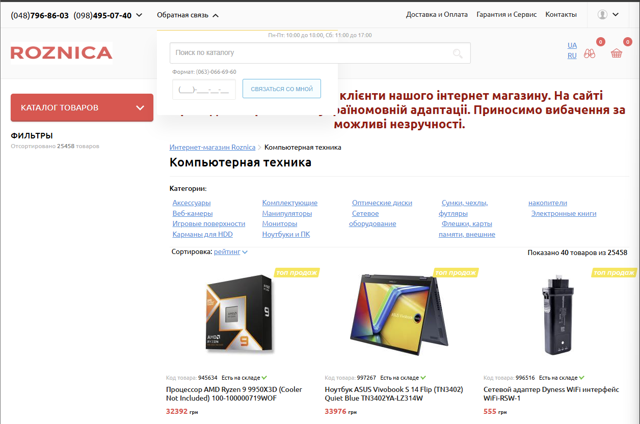 Часткове перекривання блоку зі зворотнім зв'язком полем пошуку на сторінці "Комп'ютерна техніка"