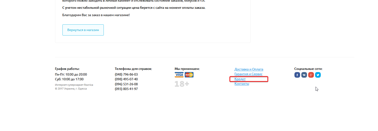 На странице успешно выполненного заказа в футере находится некорректная ссылка на раздел "Кредит"