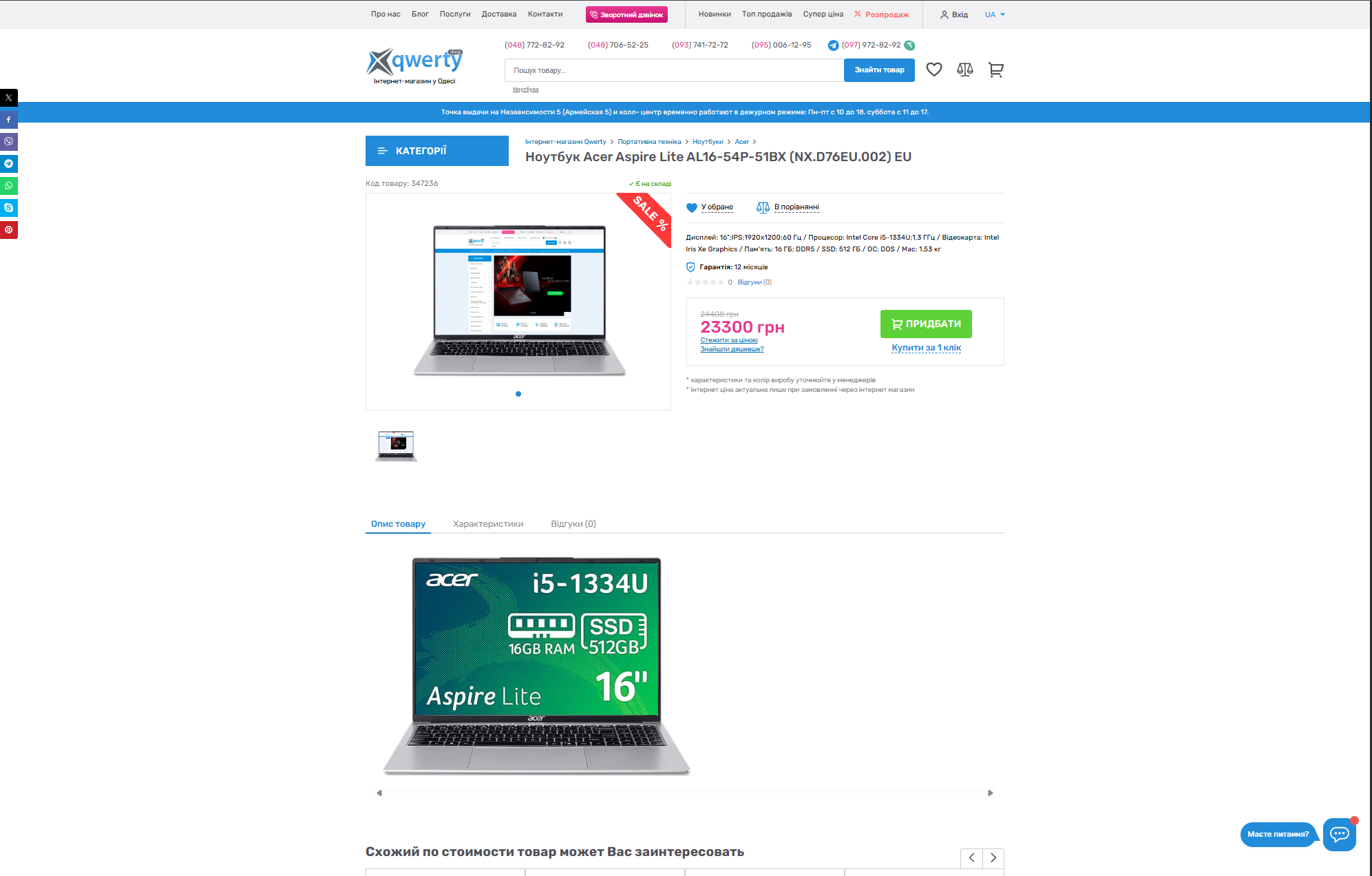 1) Відкрити сторінку товару https://qwertyshop.ua/noutbuk-acer-aspire-lite-al16-54p-51bx-nx-d76eu-002-eu-347236 .