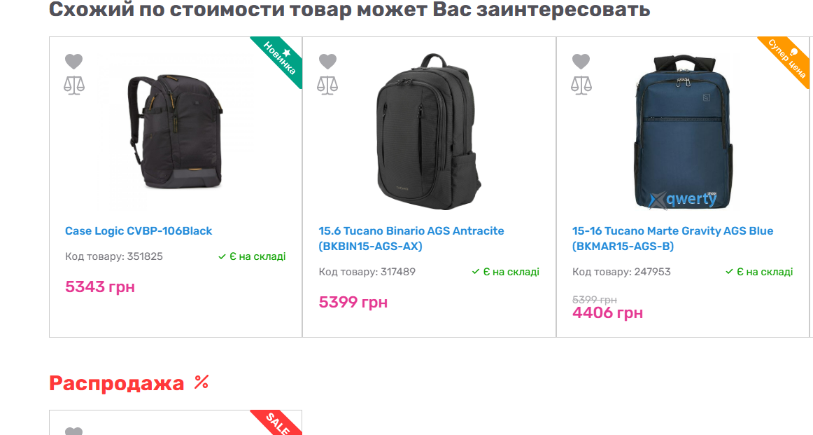 В UA версіi не локалізовані блоки “Распродажа” та “Схожий по стоимости товар”