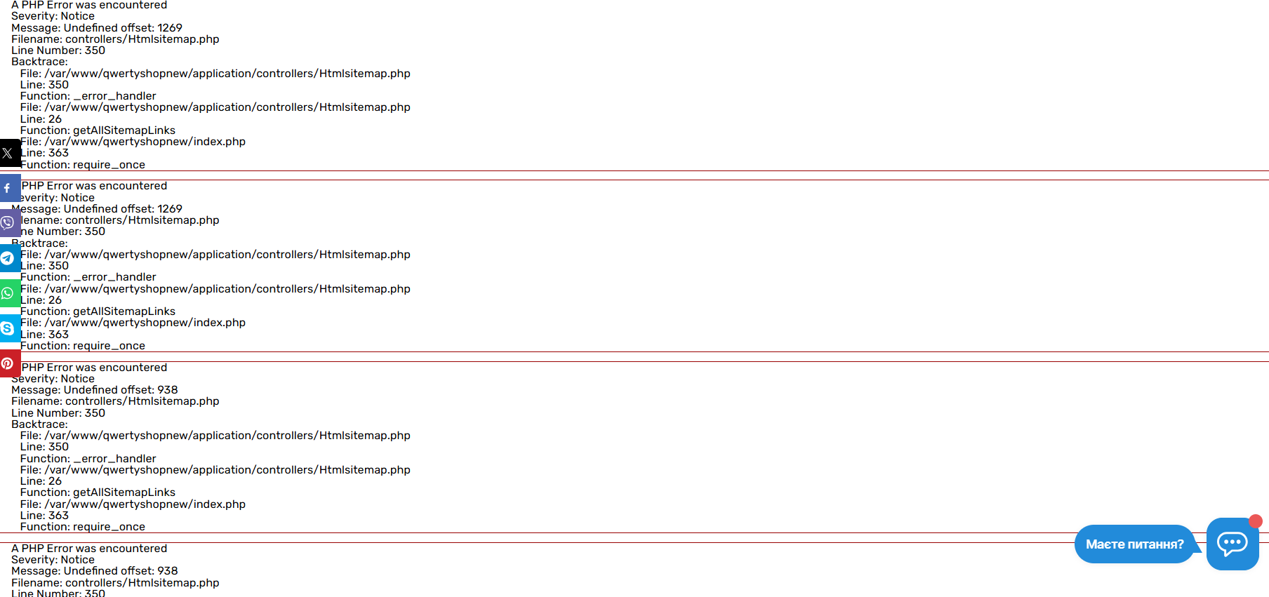 Разом з нормальним контентом відображаються технічні повідомлення типу "A PHP Error was encountered" та попередження