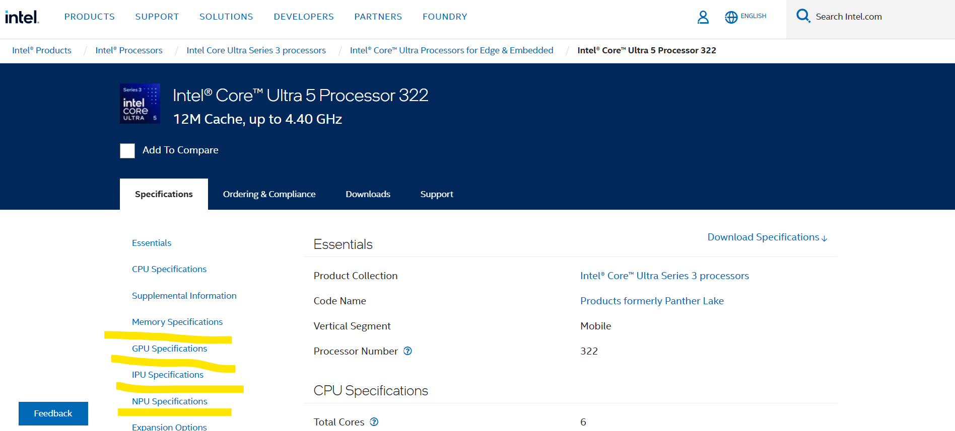 5) Перейти в закладку "Intel® Core™ Ultra Processors for Edge & Embedded"/"Intel® Core™ Ultra 5 Processor 322"
