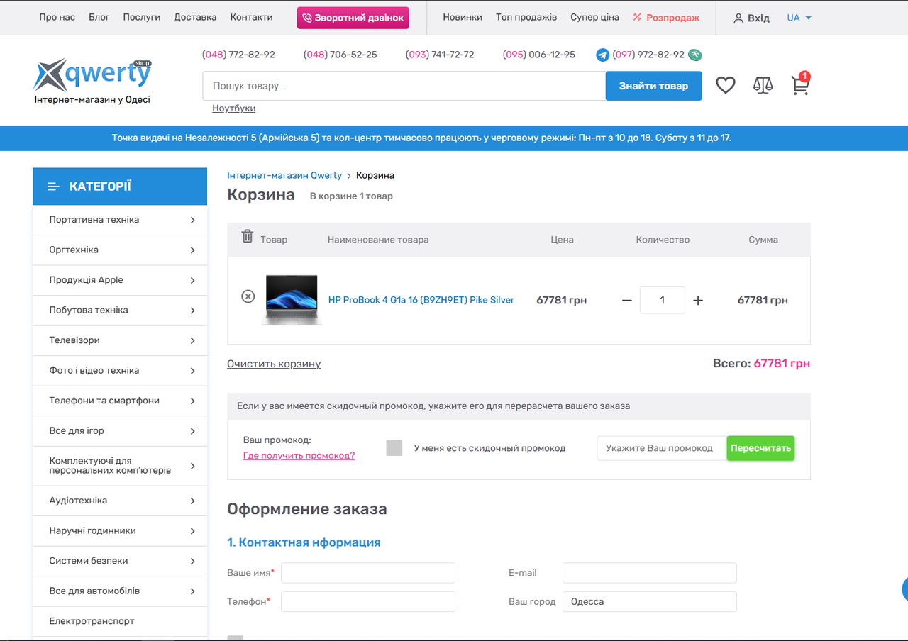 3) Перейти на сторінку кошика (клік на іконку кошика -> "Оформити замовлення" або перехід за посиланням).