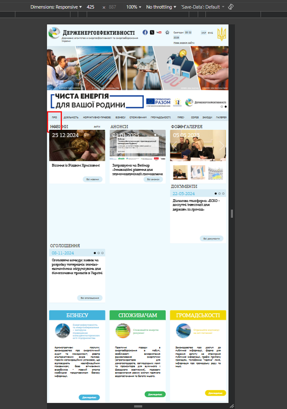 1) Відкрити сторінку https://old.saee.gov.ua/uk (або будь-яку іншу сторінку сайту) на мобільному пристрої або в емуляторі браузера (DevTools, ширина < 600px).