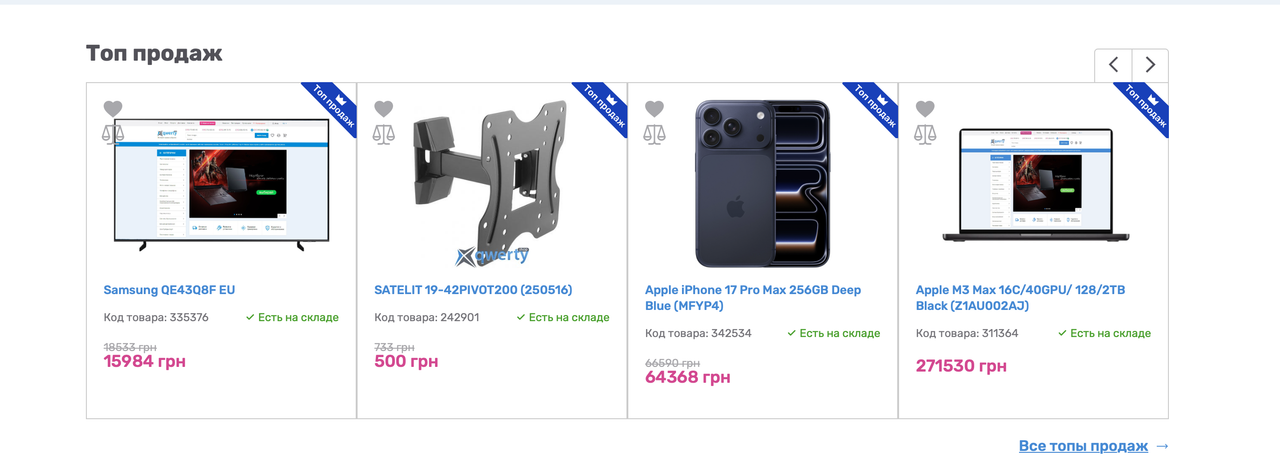 Qwertyshop.ua – Значок сравнения перекрывает изображение товара в разделе «Топ продаж»