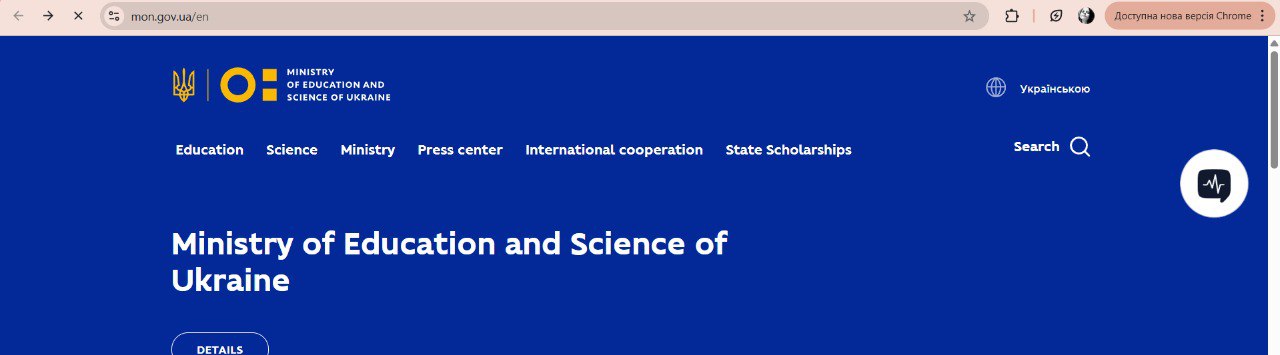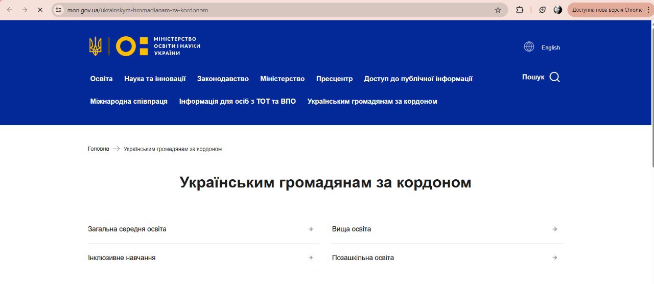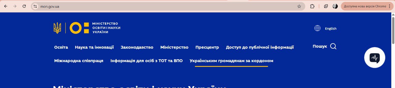 3) Перейти на будь-яку внутрішню сторінку (не головну,наприклад https://mon.gov.ua/ukrainskym-hromadianam-za-kordonom)