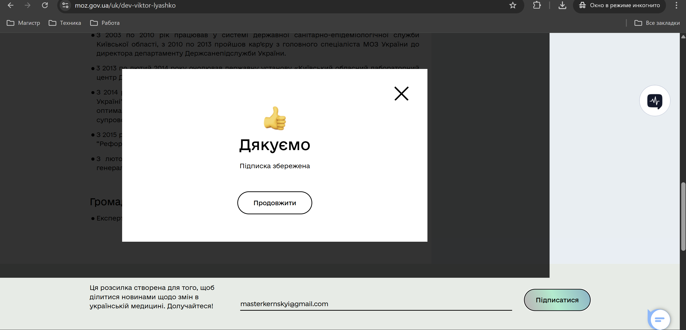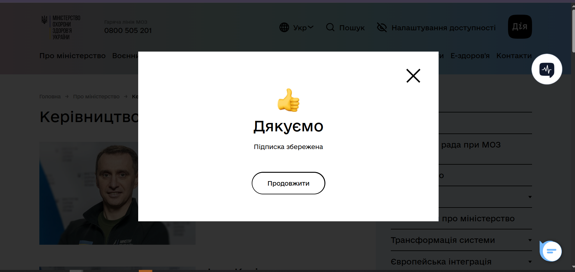Після підписки на розсилку модальне вікно не займає весь екран сторінки "Керівництво" на разрешении экрана 2880х1620.