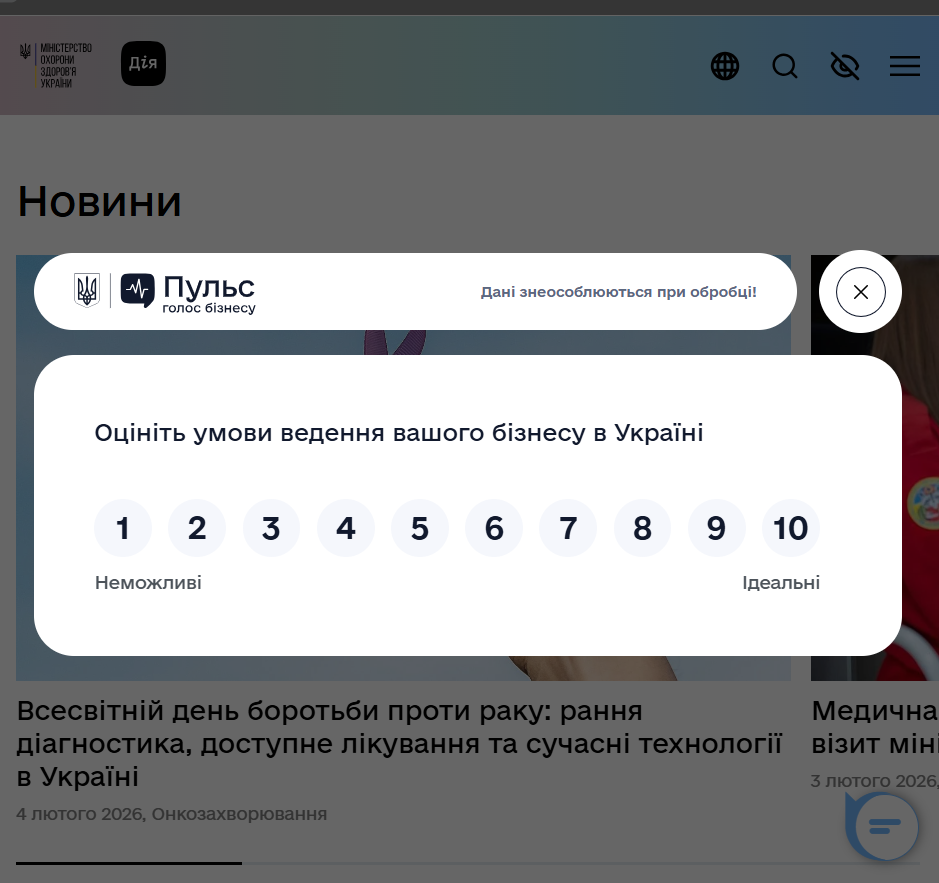 2. Дождаться появления всплывающего окна (опрос "Пульс - голос бізнесу") или вызвать его вручную