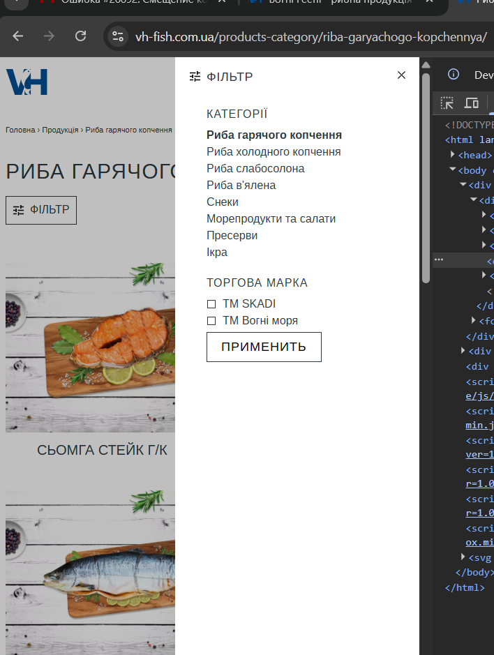 2. Перейти в любой раздел продукции. Например: https://vh-fish.com.ua/products-category/riba-garyachogo-kopchennya/