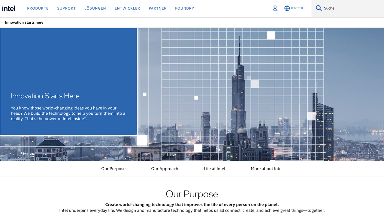 Страница "Über Intel" отображается на английском языке и не локализована.