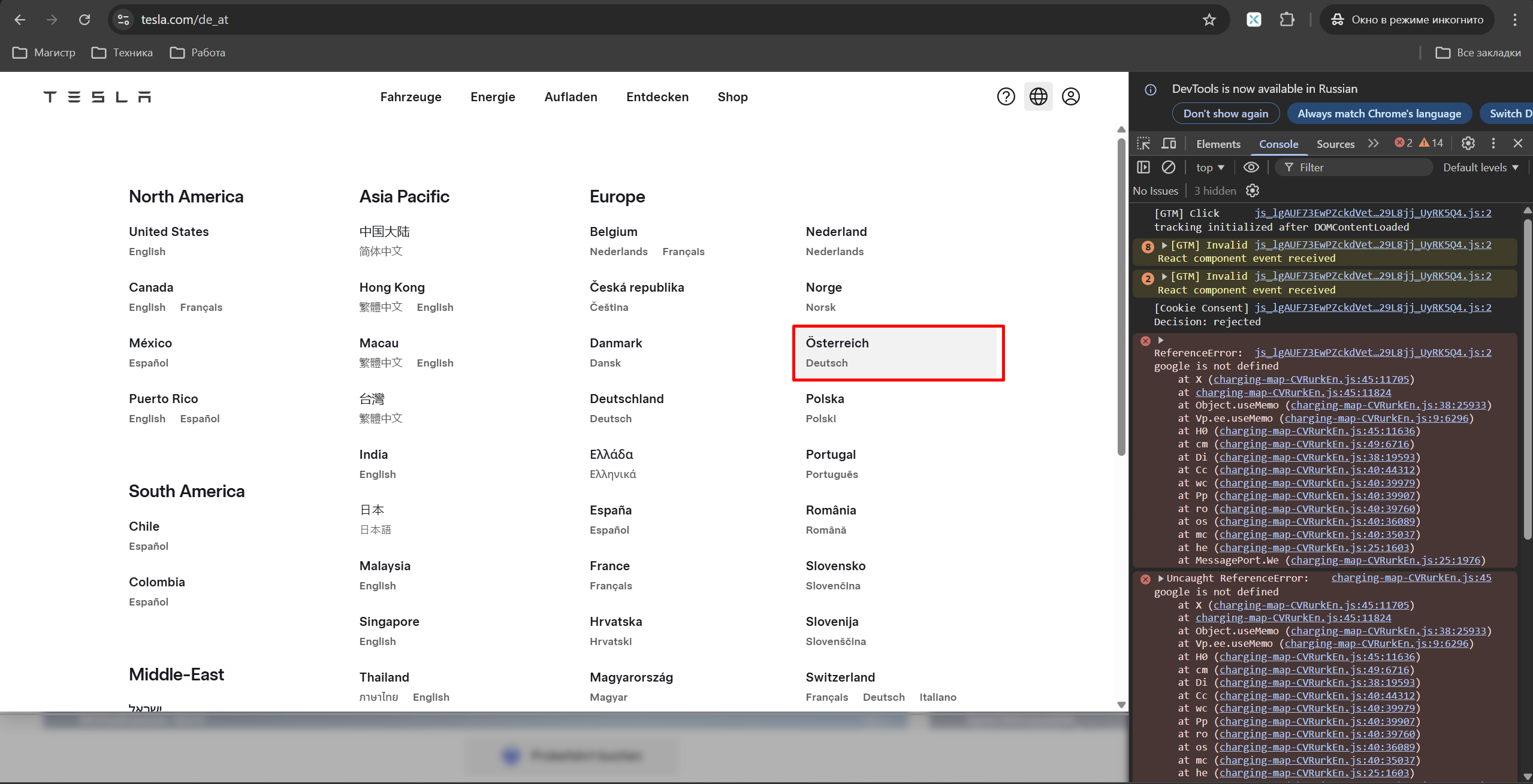 Отображается Критическая ошибка JS "ReferenceError: google is not defined" при выборе региона Österreich при включенном режиме разработчика.