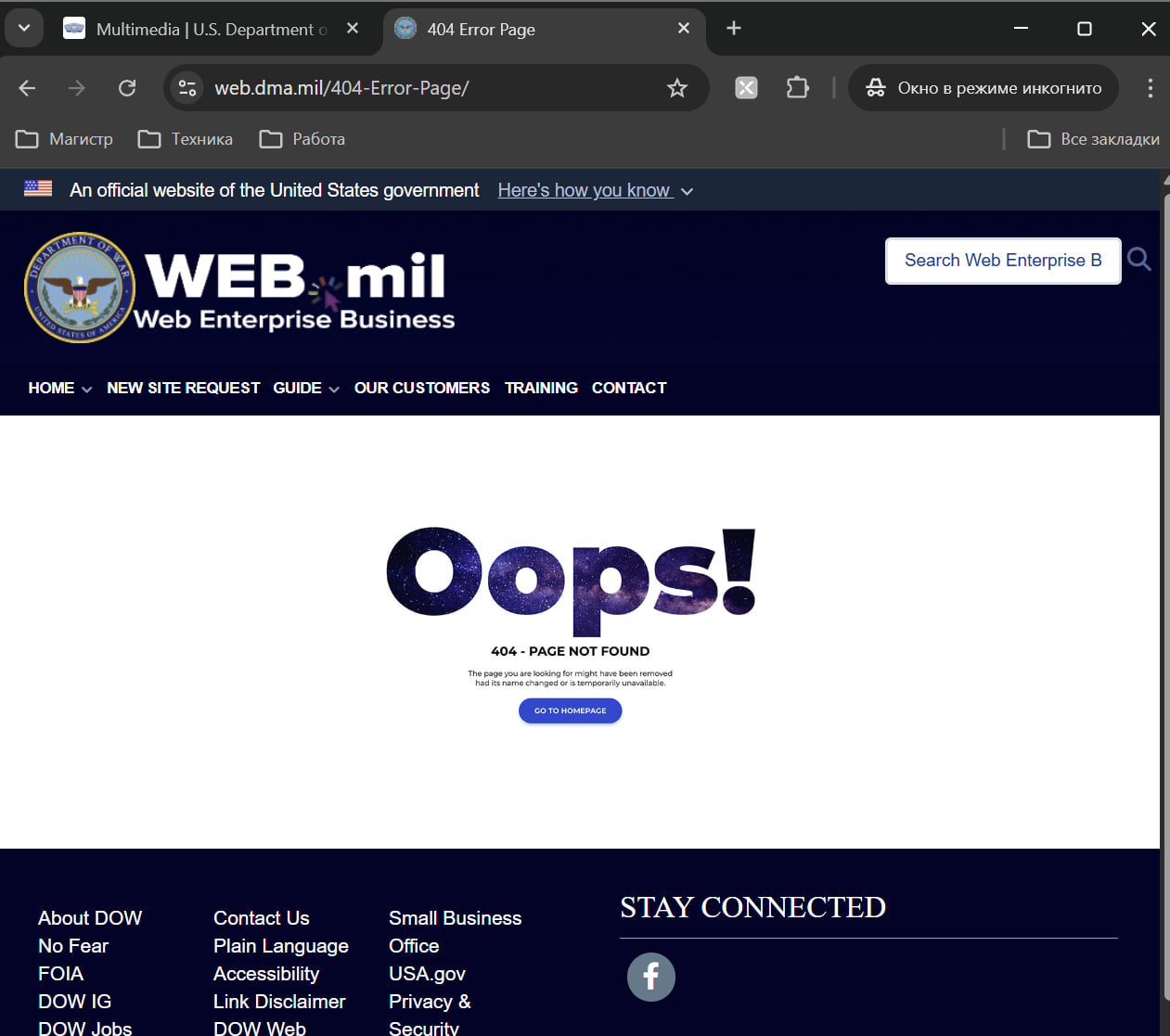 Actual result: Происходит переход на страницу ошибки "Oops! 404 - PAGE NOT FOUND". Ссылка ведет на несуществующий адрес.