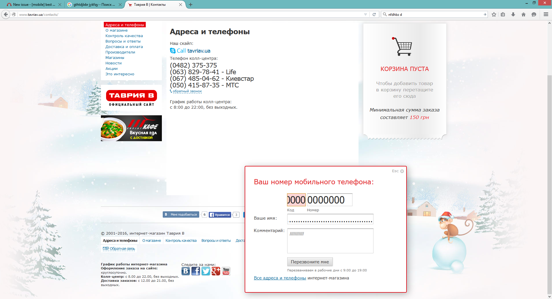 Нет валидации номера телефона в разделе "Обратный звонок", номер телефона возможно указать как все нули, в графе "Имя" написать как "........"