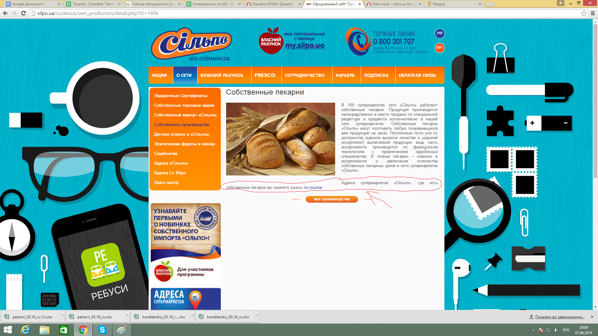 [Quarta] В разделе "О сети" "Собственное производство" "Собственные пекарни" не ровно написана на "Адреса супермаркетов"