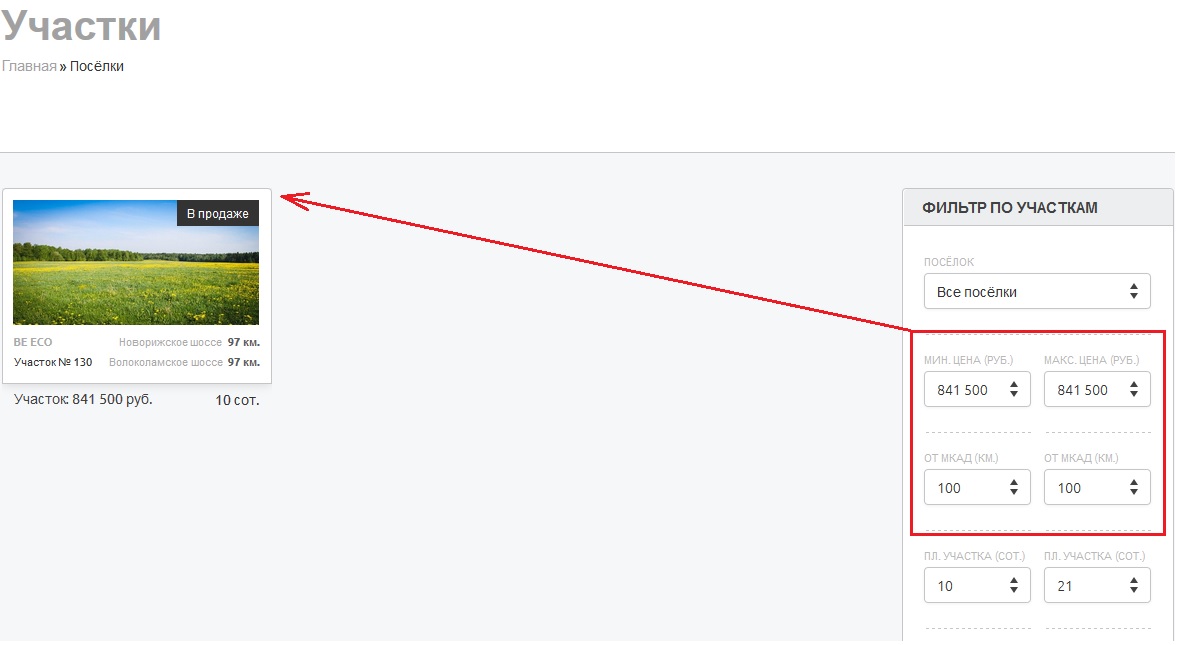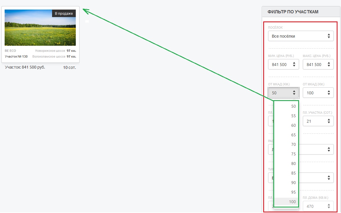 минимальной цены от 841 500 до 841 500 и выборе растояния от мкад от 100 до 100. Выдаёт одну позицию дома., то есть других вариантов больше по данному запросу нет.