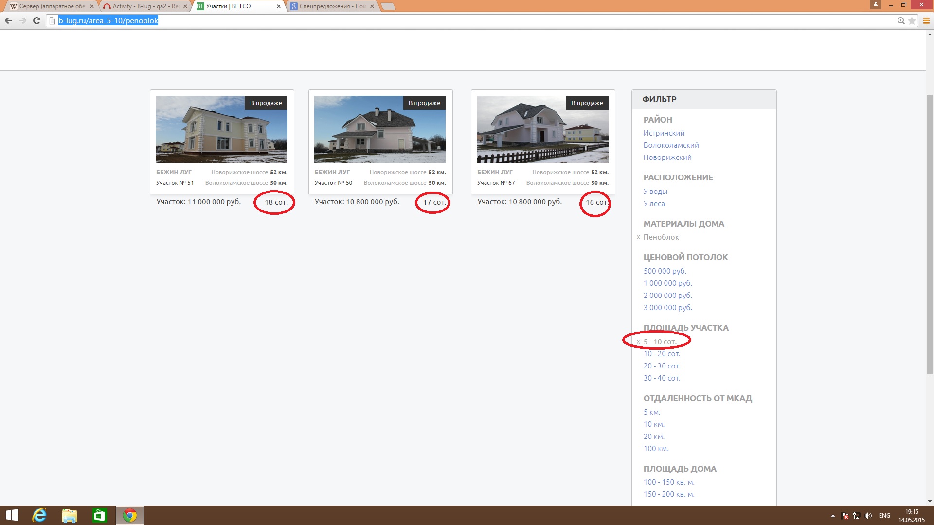Expected result: При выборе участков, площадью от 5 до 10 соток, в результате фильтрации участки имеют площадь свыше 10 соток.