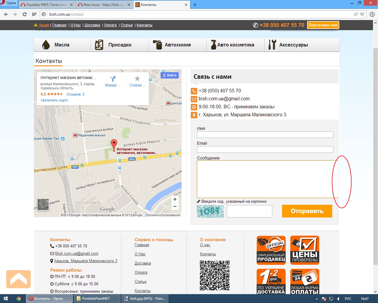 Поле сообщений в разделе "контакты" растягивается горизонтально.